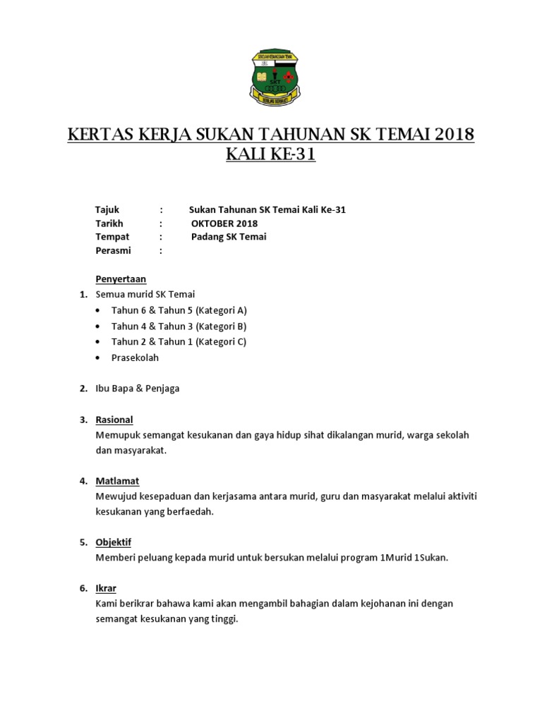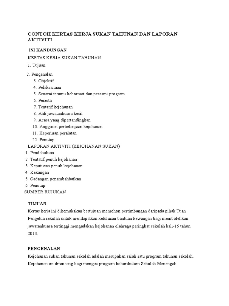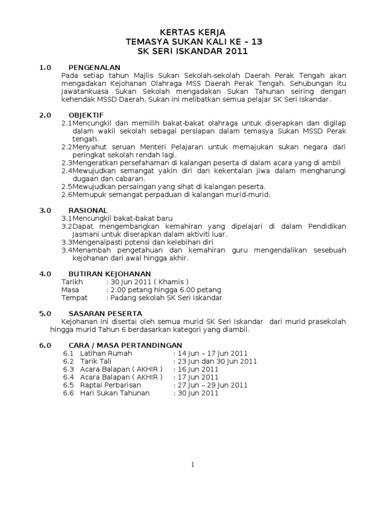 Click to view in fullscreen. Jika perlu calon boleh mendapatkan bimbingan guru sepanjang kerja projek dijalankan. Kertas kerja bulan sains dan matematik. Kertas kerja kejohanan sukan tahunan. Senarai semak pengurusan sukan tahunan. Kertas kerja kawad kaki krs. Rabu hingga ahad anjuran : Contoh kertas kerja majlis eocm oleh ledec. Kertas kerja audit (audit paperwork) adalah mata rantai yang menghubungkan antara catatan klien auditor dengan laporan audit. Contoh rencana kerja tahunan penilik. Kertas cadangan kejohanan sukan tahunan sk kpg kuala sibuti 2017 tarikh 4 5 oktober 2017, rabu masa 7.30 pagi hingga 6.00 petang tempat padang sk kpg kuala sibuti perasmian oleh yang dipertua pibg sk kpg kuala sibuti kejohanan. Kertas kerja program peningkatan akademik. Keputusan keseluruhan temasya sukan tahunan.