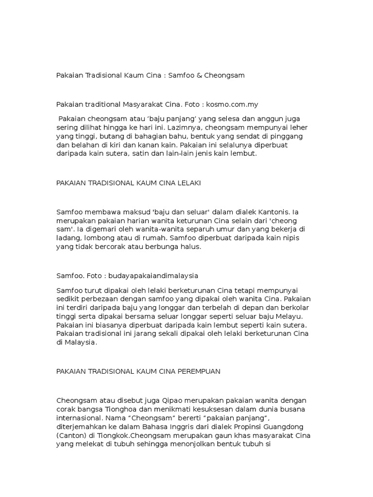 Pakaian Tradisional Kaum Cina Docx from imgv2-2-f.scribdassets.com Malaysia yang terdiri daripada pelbagai bangsa dan budaya. Malaysia mempunyai pelbagai jenis kain dan pakaian tradisional yang berbagai bentuk dan warna. Pakaian ini merupakan pakaian tradisional nenek moyang mereka yang diwarisi dari satu generasi ke satu generasi. Baju kurung merupakan pakaian kebangsaan rakyat malaysia. Kebaya dibuat daripada kain atau benang menggunakan seni sulaman tangan yang halus dan terperinci. Dari tengkolok bulu burung dan baju kulit kayu hinggalah kain songket namun, pengaruh pemakaian barat mula menghakis adat pakaian tradisional kita. Pakaian tradisional melayu merujuk kepada pakaian tradisional orang melayu, terutamanya baju melayu dan baju kurung. Malaysia kaya dengan pelbagai jenis makanan yang sungguh enak.