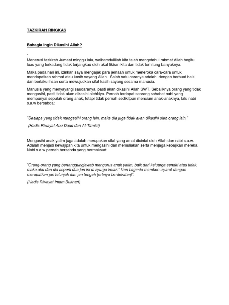 Tazkirah Ringkas from imgv2-1-f.scribdassets.com Untuk renungan pagi dari growinghill kuala terengganu. Untuk ayat kedua, ikut cara pertama hingga keempat, dan di akhir sekali baca balik dari ayat pertama hingga ayat kedua. Kita banyak bercakap untuk menampakkan diri kita tahu banyak perkara, peka semua berita. You can change your ad preferences anytime. Menerusi tazkirah jumaat minggu lalu, walhamdulillah kita telah mengetahui rahmat allah begitu luas yang terkadang tidak terjangkau oleh akal fikiran kita dan tidak terhitung banyaknya. Awani ringkas jemaah menteri akan bincang titah ydp agong ahli politik taati titah ydp agong. Full details on the tazkirah ringkas telegram channel where interesting information is published. Dan begitu juga untuk ayat ketiga hingga habis satu surah.